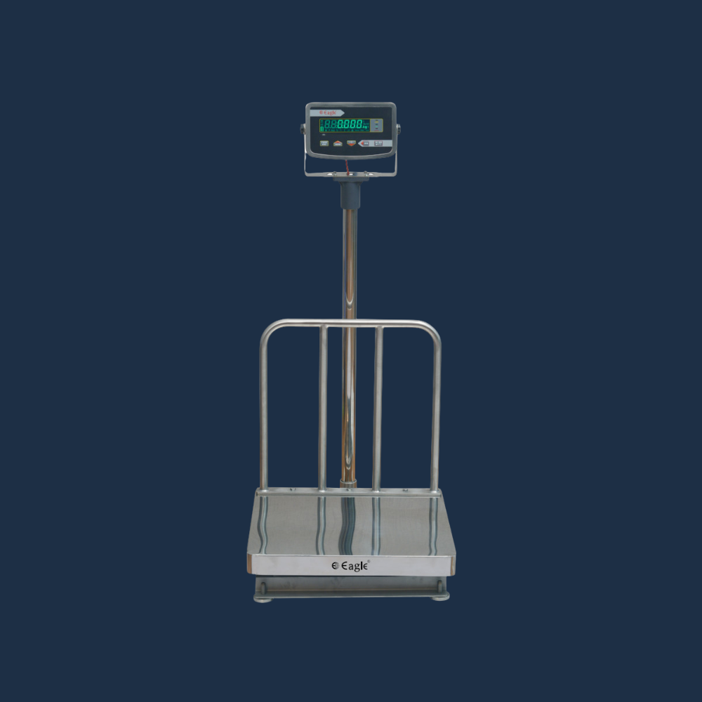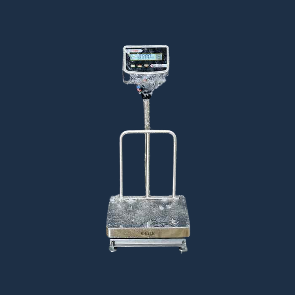 This waterproof weighing scale features a bright green LCD display for clear and easy visibility. It is built with a 304 food-grade stainless steel platform, available in 400 × 400 mm, 500 × 500 mm, and 600 × 600 mm sizes, ensuring durability and suitability for food-related industries.